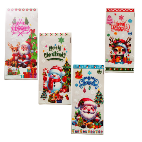 Négyféleszíféle mintájú, átlátszó karácsonyi / Mikulás témájú, celofán zacskó csomag, arany színű kötöző dróttal. A zacskók mérete 27 cm x 12 cm