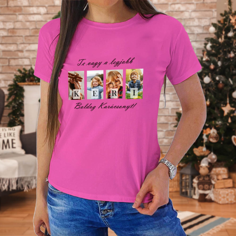 Puha, 100% pamut női póló, amely tökéletes karácsonyi ajándék keresztanyáknak. A „Te vagy a legjobb Keri” minta és 4 saját fotó teszi különlegessé.Ajándékötlet: válaszd mellé a hozzá illő bögrét vagy párnát, így teljes karácsonyi szettet adhatsz a szerete
