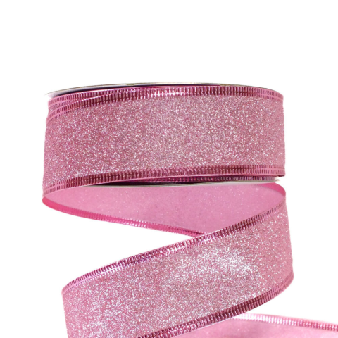 Karácsonyi szalag glitteres - rózsaszín, drótos szegéllyel