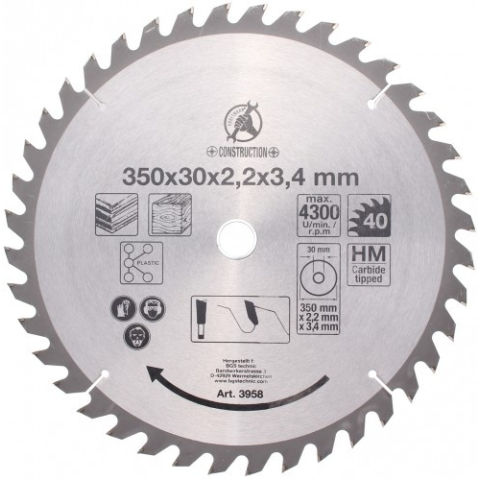 Karbid fogak MPA minősítés Technikai adatok: - Max. fordulatszám: 4300 rpm - Tárcsa vastagsága: 2.2 mm - Fogak száma: 40 db - Tárcsa teljes átmérője: 350 mm - Tengelyfurat átmérője: 30 mm - Vágási szélesség: 3.4 mm