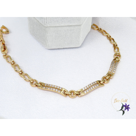 Gold Filled középen három hosszú szem díszíti szélén apró kis kövekkel Szin: 18K Méret: 17cm+2cm -el hosszabbítható Szélesség: 5mm