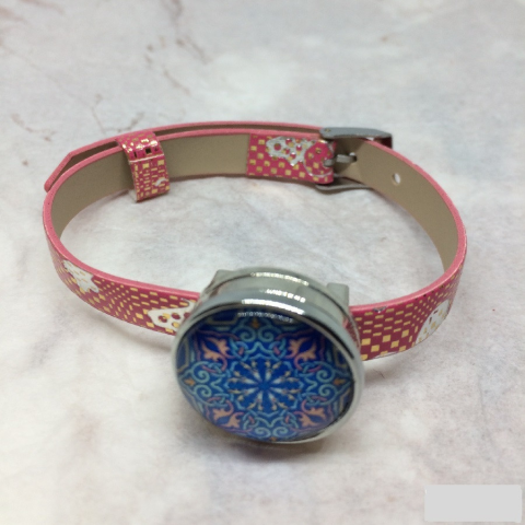 Karkötő: mintás rózsaszín műbőr, 21 cm hosszú, 8 mm széles, csatos Medál: cserélhető patent, a szíjon állítható, átmérője 2 cm Kiknek ajánljuk a kézműves karkötőt? - Stílusos kiegészítők kedvelőinek: Akik szeretik az egyedi és kézzel készített ékszerek
