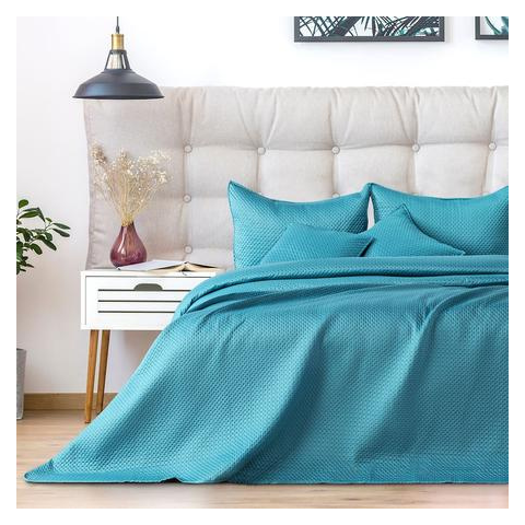 Steppelt türkizkék ágytakaró franciaágyra 240x260 cm 100% PE puha matt szatén anyagból, geometrikus dombornyomással steppelt mintával 30 fokon kézzel és géppel is mosható nem gyűrődik és nem kell vasalni ÖKo-Standard 100 tanúsítv