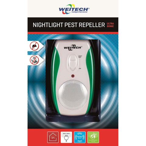 Ultrahangos beltéri kártevőriasztó, ultrahangos jelek kibocsátásával tartja a kártevőket (egerek, patkányok, pókok, bolhák, kullancsok és mászó rovarok) távol otthonától, garázsból, padlásról stb. Legfeljebb 90 m2-es területet biztosít. A védett terület jelentősen csökken a helyiség torlódásától és a falakat, padlókat és mennyezetet alkotó anyagoktól függően. Beltéri használatra szolgáló eszköz működési jelzőfénnyel.