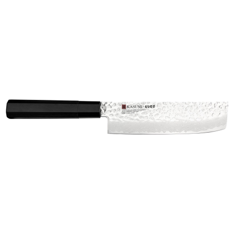 A Kasumi Kuro fő vágólapja molibdén vanádium acélból (AUS8) készül. A pengék a Rockwell C58-hoz edzettek. A kések mindkét oldalán gyönyörű,32 rétegű damaszkuszi minták találhatók. Kalapácsolt kivitel, hagyományos japán stílusban. A Kalapácsos felület me