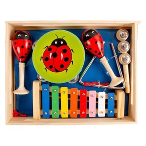 Katica fa hangszer 6 darabos készlet Játsszátok el kedvenc zenéiteket fa hangszereken! Ehhez nyújt most segítséget ez az aranyos, katicabogár mintás hangszer készlet! Ha van négy igen lelkes zene szerető barátod, ideje együttest alapítanotok! Egyezz