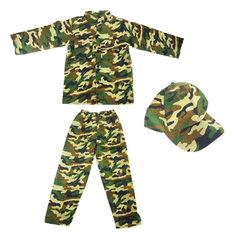 Terepszínű farsangi gyermek katona jelmez. Szuper katona jelmez, melyel átélhted egy katona izgalmas mindennapjait. Tartalma: - zubbony - nadrág - siltes sapka - Méret: S: 120 cm - Méret: M: 130 cm - Méret: L: 140 cm