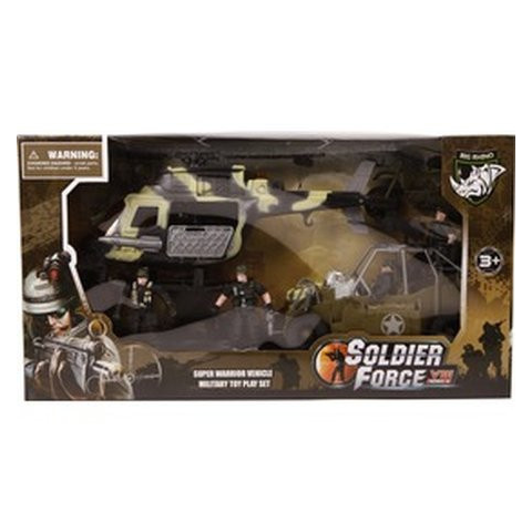 Komplett Csata Szett: Tartalmaz helikoptert, ponyvás teherautót és két mozgatható végtagú katona figurát.