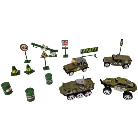 A 15 darabos katonai készlet fémautókat és tartozékokat tartalmaz.