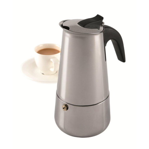 - A dekoratív, 4 személyes kotyogós kávéfőző praktikus, cseppmentes kiöntője biztosítja a könnyű kezelhetőséget.- A kotyogós kávéfőző ?anyaga rozsdamentes acél, a fogantyúja fekete színű hőálló műanyagból készült.- A biztosí
