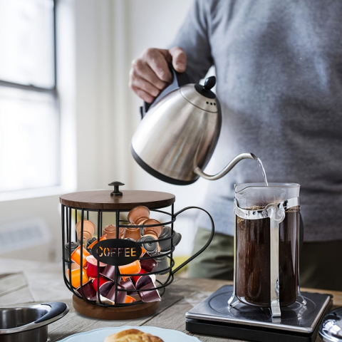 Ha igazi kávérajongó vagy, ez a Kávékapszula tartó a te világod! Az elengedhetetlen tartozék minden kávébarát számára, amely segít rendben tartani a kávékapszulákat, hogy mindig tökéletes csésze kávét készíthess. Ez az egyedi, modern dizájnú kávékapszula-tartó tökéletes kiegészítője lesz a konyhának, az irodának vagy akár a bárnak! Ez a nagy kapacitású, fekete/arany drótokból készült tároló kényelmesen elfér pultodon, így soha nem fogsz kifogyni a