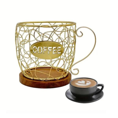 Kávékapszulatartó – arany színű, fedél nélkül, RP1387967-AStílusos és praktikus kávékapszulatartó arany színű fémhálóval, amely kávéscsésze formájával különleges hangulatot kölcsönöz a konyhának. Ideális a kávékapszulák rendszerezett és könnyen hozzáférhető tárolásához, miközben dekoratív eleme is a kávézósaroknak.Főbb jellemzők:Anyag: fémSzín: aranyMéret: 15 × 12,5 × 11 cmSúly: kb. 250 gNyitott kialakítás a kapszulák egyszerű elérés