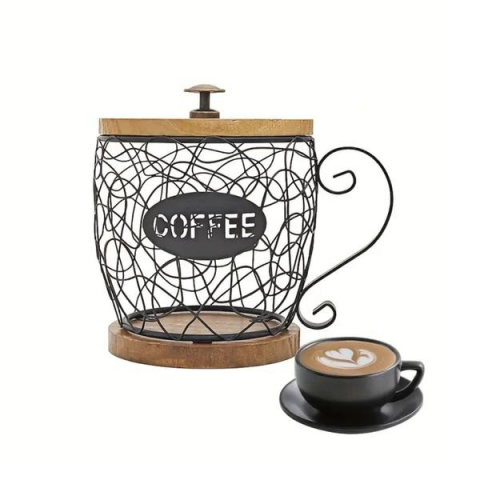 Kávékapszulatartó fedéllel – fekete színű, RP1387967-FElegáns és praktikus kávékapszulatartó, amely stílusos arany színű fémhálóval és fa fedéllel rendelkezik. Különleges kialakítása kávéscsésze formát idéz, így nemcsak hasznos, hanem dekoratív kiegészítője is lehet a konyhának.Főbb jellemzők:Anyag: fém és faSzín: feketeMéret: 15 × 12,5 × 11 cmSúly: kb. 250 gPraktikus fedél a kapszulák frissen tartásáhozDekoratív kávéscsésze formájú kialakí