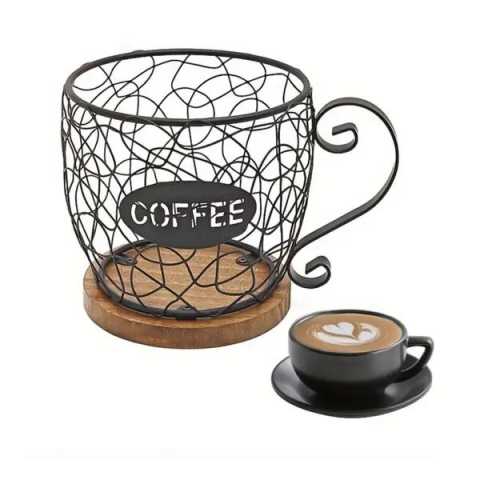 Kávékapszulatartó – fekete színű, fedél nélkül, RP1387967-F2Stílusos és praktikus kávékapszulatartó arany színű fémhálóval, amely kávéscsésze formájával különleges hangulatot kölcsönöz a konyhának. Ideális a kávékapszulák rendszerezett és könnyen hozzáférhető tárolásához, miközben dekoratív eleme is a kávézósaroknak.Főbb jellemzők:Anyag: fémSzín: feketeMéret: 15 × 12,5 × 11 cmSúly: kb. 250 gNyitott kialakítás a kapszulák egyszerű elér
