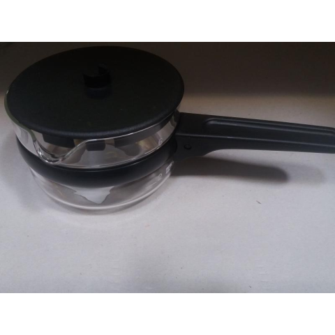 Üveg kávékiöntő, anyaga: műanyag és üveg. 6 személyes. Magassága kb. 7,5 cm a kiöntő csőr részével együtt. Átmérője 10,5 cm.