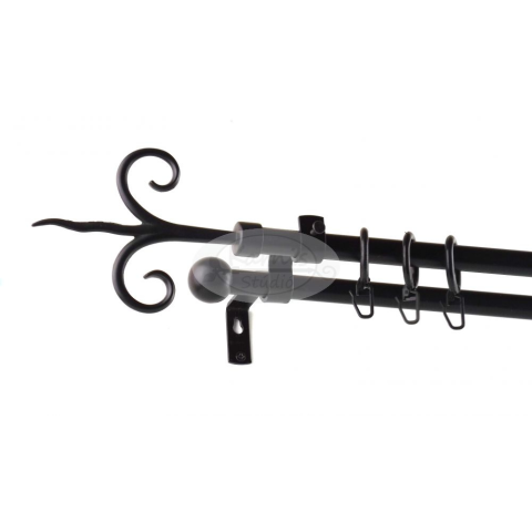 A KECSKEMÉT fekete 200 cm-es 2 rudas fém karnis szett tartalma: 2 db fekete 200 cm-es fém karnisrúd 2 db Kecskemét típusú fekete fém végzáró 2 db Veszprém típusú kis gömb végzáró 2 db falra szerelhető fém konzol a felszereléshez szükséges tiplik és csav
