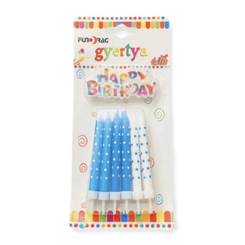 Egy csomagban 12 darab gyertya található , 12 darab műanyag tartóval és 1 Happy Birthday felíratú beszúróval. Anyaga: paraffin Egy darab gyertya hossza: 9 cm. A gyertyák műanyag talppal érkeznek.