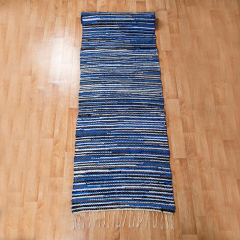 Kék-fehér-fekete kézi készítésű rongyszőnyeg 70x300 cm-es méretben, amely kitűnő választás, a ház bármely helyiségéről is legyen szó.