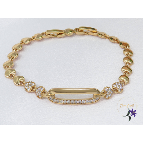 Gold Filled szivacskés szemekből álló karkötő , középen egy hosszabb köztes .apró cirkóna kövek díszítik Szin: 18K Méret: 17cm+1,5cm -el hosszabbítható szélesség: 5-7mm