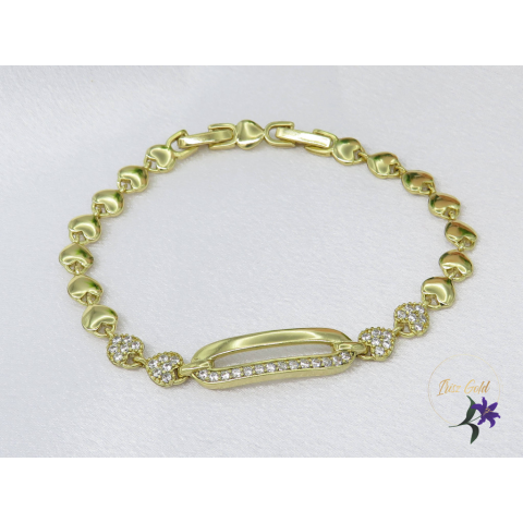 Gold Filled szivacskés szemekből álló karkötő , középen egy hosszabb köztes .apró cirkóna kövek díszítik Szin: 14K Méret: 17cm+1,5cm -el hosszabbítható szélesség: 5-7mm