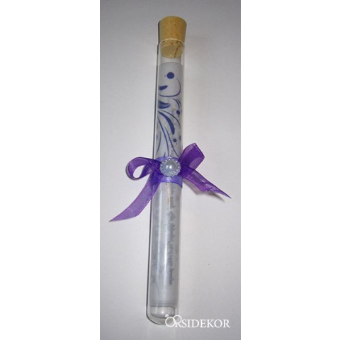Esküvői meghívó kínálatunk egyik újdonsága ez a különleges kémcsöves, parafadugóval lezárt meghívó, amelyben egy A5-ös méretű pausztekercs található. Pauszpapírra nyomtatjuk az általad küldött szöveget, melyet a választott minta