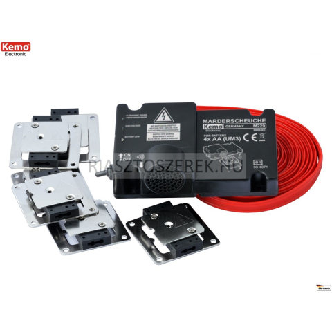 Kemo M229 elemes ultrahangos készülék nagyfeszültségű lapokkal gépjárművekbe A KEMO M229 készülék saját áramforrásról (4 x AA, ceruza elem) üzemel, így nem használja a gépjármű akkumulátorát. Modern mikroprocesszoros vezérléssel ellátott nyestriasztó kész