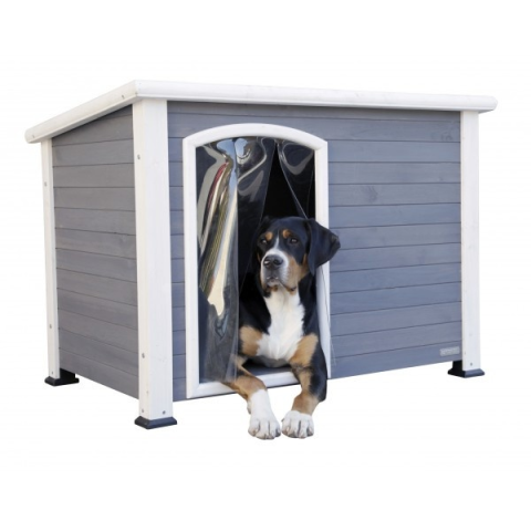 Kenny kutyaház - szürke/fehér, időjárásálló - Kiváló minőségű, időjárásálló kutyaház közepes méretű kutyák számára. Bitumenes tető, műanyag lábak és átlátszó függöny védi a kedvencét. Könnyen összeszerelhető. Kenny szürke/fehér időjárásálló kutyaház -