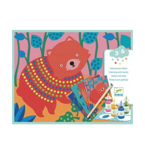 Pöttyöző képkészítő készlet a Djeco-tól. Ecset használat előtti pöttyöző, festék és eszköz.Pöttyöző festőkészlet 4 kép díszítéséhez, elkészítéséhez. A gyermeknek 4 kis pöttyözőpálcikája van, amelyeket a festékbe márt. Ezután ezeket a színeket az illusz
