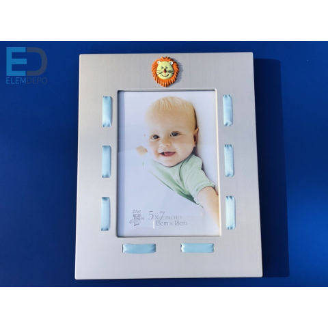 képkeret képméret: 13x18cm külső méret: 19,5cm x 24cm oroszlános dísz kék szalaggal átfűzve plüss hátlap, asztalra, polcra.....
