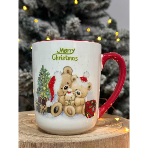 Karácsonyi bögre kerámiából, mackócsalád mintával. Mérete: 500ml