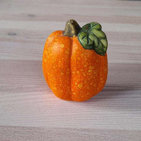 Narancssárga kerámia tök kockás szatyorkában.
