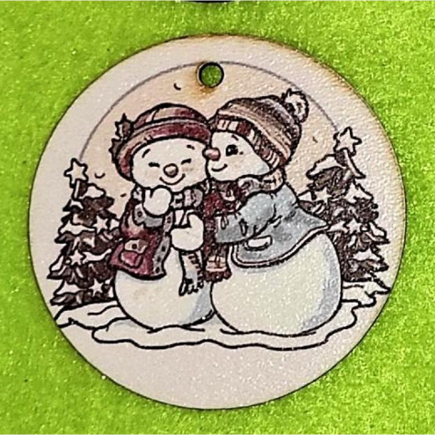 1 kép Kerek nyomtatott fa tábla, két hóemberrel. Mérete: 5 cm