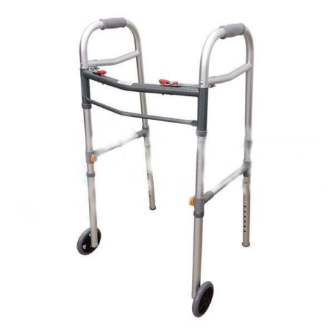 Kerekes járókeret összecsukható 11948 Kerekes járókeret összecsukható 11948 Összecsukható járást segítő járóbot Könnyű alumínium vázszerkezetű járókeret, alsó végein gumidugóval, mely megelőzi az elcsúszást. Gumírozott fogantyúkkal, állítható magassá