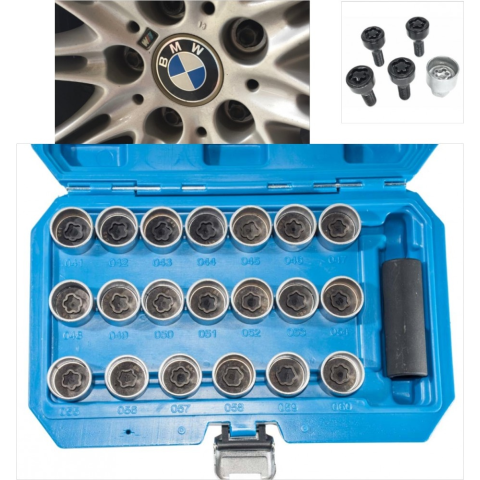 Kerékcsavar/kerékőr kiszedő készlet BMW járművekhez. 21 darabos Segítségével könnyen eltávolítható a kerékőr a csavar vagy a kerék károsodása nélkül is. Készlet tartalma: 20db kerékőr leszedő adapter: 041 - 060 041, 042, 043, 044, 045, 046, 047, 048, 04