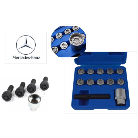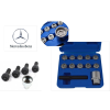 Kerékcsavar/kerékőr kiszedő készlet Mercedes járművekhez. 12 darabos Segítségével könnyen eltávolítható a kerékőr a csavar vagy a kerék károsodása nélkül is. Készlet tartalma: 10db kerékőr leszedő adapter. Méretek: M12 x 1.5 x 40mm, M14 x 1.5 x 26mm/26.5