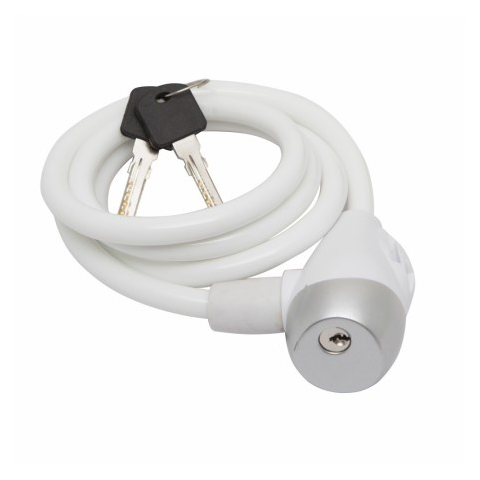 Kerékpár lakat 10 mm x 120 cm fehér Kerékpár lakat (kábelzár). A bevont acélkábel ellenállóbb a vágó támadásokkal szemben. Minőségi zárszerkezet, 2 db kulccsal. Méret: 10 mm x 120 cm Szín: fehér
