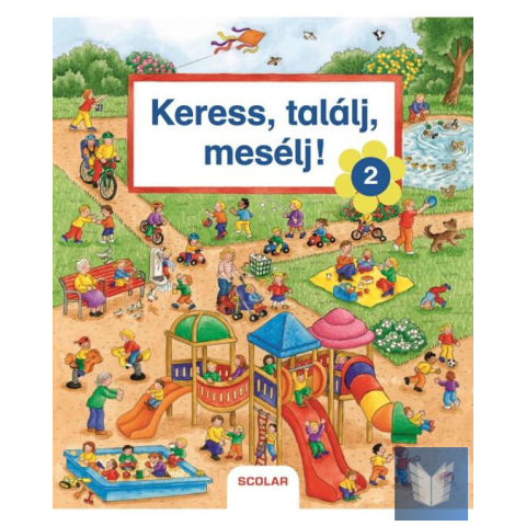 A második Keress, találj, mesélj! képeskönyv oldalai rengeteg keresni-, találni- és mesélnivalót rejtenek. Piac, óvoda, építkezés, orvosi rendelő, strand, állatkert, bevásárlóközpont, vasútállomás – mind-mind izgalmas, felfedezésre váró helyek az apróságo
