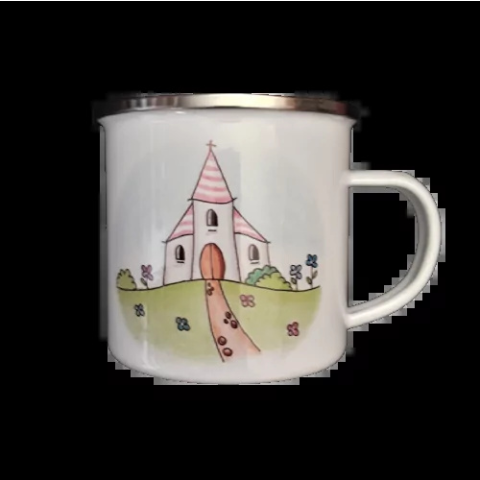 Keresztelő ajándék kislánynak fém bögreZománcozott fém bögre rózsaszín tetejű templomos mintával, amely a bögre túloldalán elhelyezett tetszőleges felirattal ellátható. Kiváló keresztelő ajándék kislánynak.Elkészítési idő 5 munkanapA fém anyag miatt mikrohullámú sütőbe nem tehető be. Mosogatógépben tisztítható.
