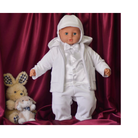Hat darabos készlet Tartalmazza : kordbársony zakót szaténbéléssel, nadrág és a sapka kordbársony. Mellény 3 gombos és a csokornyakkendő varrott szép finom fehér szatén, galléros ing.