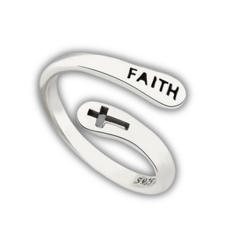 Különleges ezüst színű keresztes gyűrű "Faith" gravírozással. Stílusos és szimbolikus ékszer a hit megéléséhez