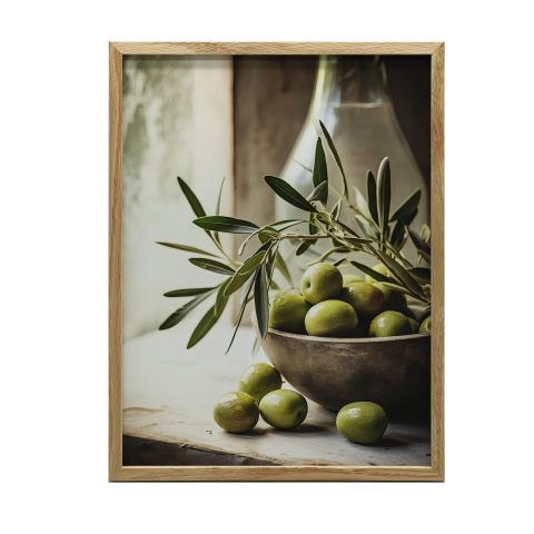 Olívaágak és olaj - Fali poszter fekete alumínium keretben (70x100 cm) Elegáns és stílusos fali dekoráció a modern otthonokba. Ez a gyönyörű poszter egy tálban lévő olajbogyót és olajágot ábrázol, nyugodt és természetközeli hangulatot teremtve. A 230...