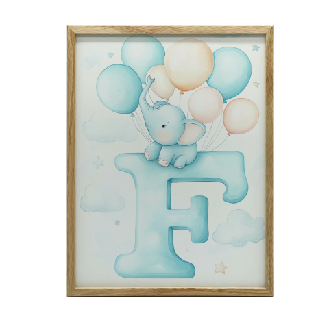Bábáelefánt F betűvel - Gyerek Szoba Dekoráció 50x70 cm Ez a gyönyörű, kézzel festett plakát tökéletes választás a gyerekszoba dekorációjához! Egy aranyos kis elefánt bébi ül az F betűn, színes lufikkal a kezében. A vidám kép garantáltan mosolyt csal...