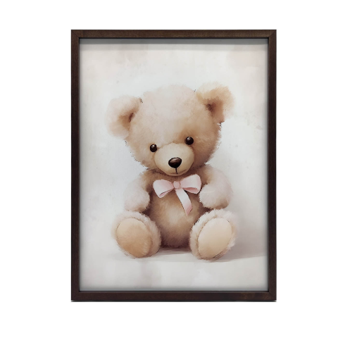 Gyerek szoba dekoráció: Cuki mackó rózsaszín masnival - 70x100 cm-es falikép Ez a bájos, 70x100 cm-es falikép egy aranyos mackót ábrázol rózsaszín masnival. Tökéletes választás gyerekszobákba, hogy vidám és meghitt hangulatot teremtsen. A kép Marcin...