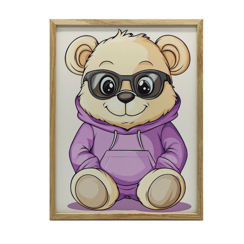 Lila Kapucnis Mackó Plakát: Vidám Dekoráció a Házba 🐻💜 Ez a gyönyörű, kézzel készített plakát egy aranyos mackót ábrázol lila kapucnis pulóverben és napszemüveggel. Tökéletes választás gyerekszobába, nappaliba vagy bármelyik helyiségbe, ahol egy ki...