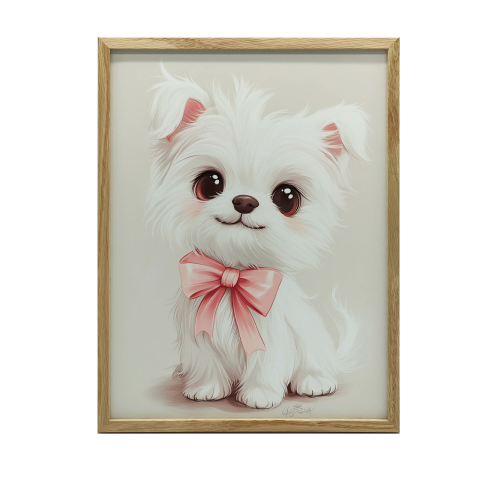 Kedves kutyus faliplakát sötétbarna keretben: Vidám dekoráció otthonába 🐶 Ez a bájos faliplakát egy aranyos kutyust ábrázol rózsaszín masnival. Tökéletes választás, ha szeretné feldobni otthonát egy cuki és vidám dekorációval. A sötétbarna fa keret e...