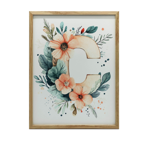 Virágos C betűs falikép sötétbarna keretben - 70x100 cm 💐 Hozzon be egy kis természetet és eleganciát otthonába ezzel a gyönyörű faliképpel! A képen egy finom, akvarell stílusú C betű látható, amelyet gyönyörű virágok és levelek vesznek körül. A söt...