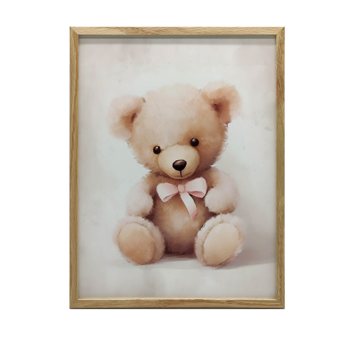 Rózsaszín Masnis Medve Fali Kép Gyerekszobába - 50x70 cm 🐻🎀 Varázsolj meghitt hangulatot a gyerekszobába ezzel a bájos, rózsaszín masnis medve képpel! A világos tölgyfa keretbe foglalt, 50x70 cm-es poszter tökéletes választás a kicsik birodalmába, d...