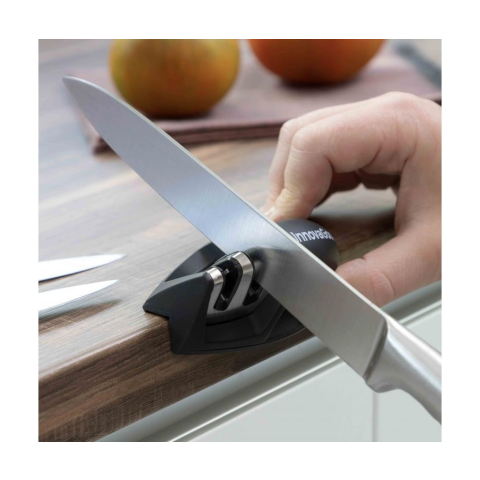 Információk A praktikus univerzális késélező rozsdamentes acélból készült, fa fogantyúval. Nagyon hasznos minden konyhában. Ennek köszönhetően minden kést sima pengével élezünk. Helyezzük az élezőt egy sima felületre, és tartsuk erősen.