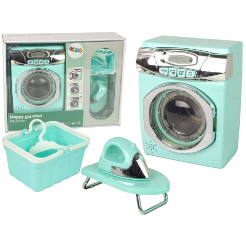Mosógép, vasaló és vállfák készlete Ez a készlet remek játék azoknak a gyerekeknek, akik szeretik utánozni a felnőtteket és részt venni a mindennapi háztartási teendőkben. Ennek a készletnek köszönhetően a kisgyermekek fejleszthetik a képzelőerejüket, megtanulhatják a felelősséget és javíthatják a manuális készségeiket. A menta színű mosógép realisztikus megjelenésével és interaktív funkcióival lenyűgözi a gyerekeket. Elemek behelyezése után a kész
