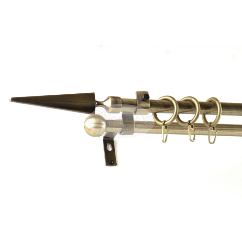 A KESZTHELY óarany színű 2 rudas fém karnis szett tartalma: 2 db 120 cm-es óarany színű fém karnisrúd 2 db Keszthely típusú óarany színű fém végzáró 2 db Veszprém típusú kis gömb végzáró 2 db falra szerelhető fém konzol 24 db óarany színű műanyag karika